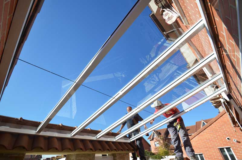 Time lapse que ilustra la colocación de techo móvil en patio.